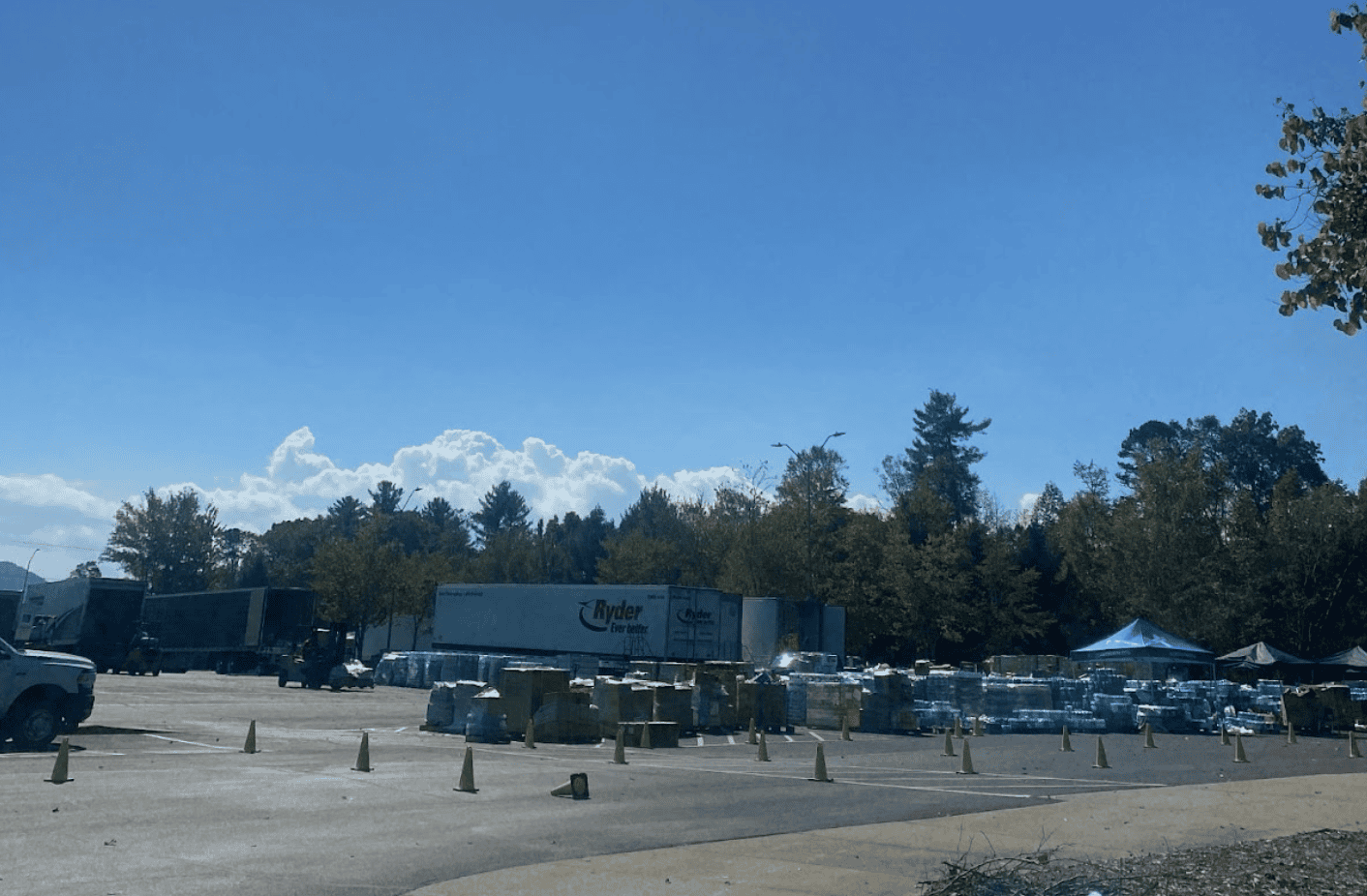 Semi-trucks full of supplies line up to be organized Oct. 7, in Arden, North Carolina. Every day numerous semi-trucks would arrive with volunteers waiting to unload them. Photo by Emma Heard