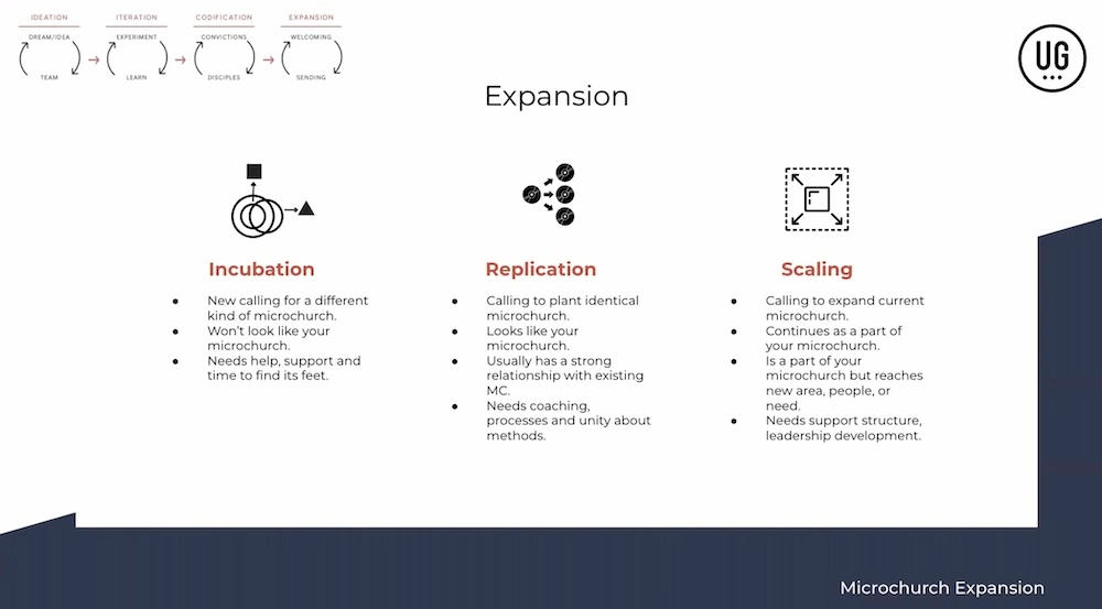 Incubation means a new calling or direction that changes the original microchurch. Replication means planting new micro churches that follow the same model as the micro church. Scaling simply means growing the number of members, outreach and needs within the micro church.