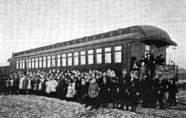 A children’s meeting on the Baptist chapel car, “Glad Tidings,” in 1910. Photo by American Baptist Publication Society for Wikimedia Commons