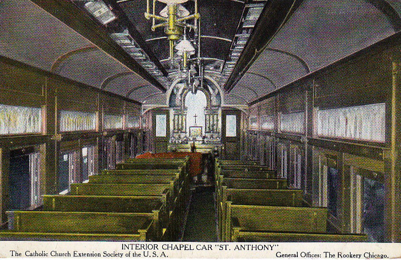 The postcard depicts the exterior of the “St. Anthony” Chapel car. The “St. Anthony” remained in service from 1909 to 1919, according to Wikipedia. Photo by The Catholic Extension Society of the U.S.A. for Wikimedia Commons